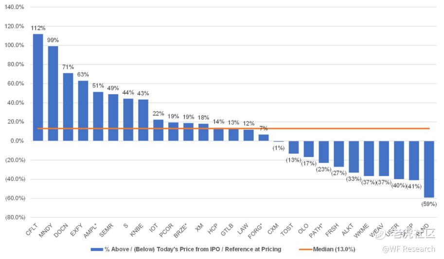 尽管这些公司的股价较 IPO 时的价格有大幅上涨,但在过去 9 周,市场对 SaaS 公司并不友好。截至 2021 年 12 月 31 日,27 家公司中有 11 家公司(40%)的股价低于其 IPO 时的参考价。截至同一时期,WalkMe、Blend Labs、Squarespace 和 UiPath 的估值也低于它们最近一次公布的私募融资的估值。
