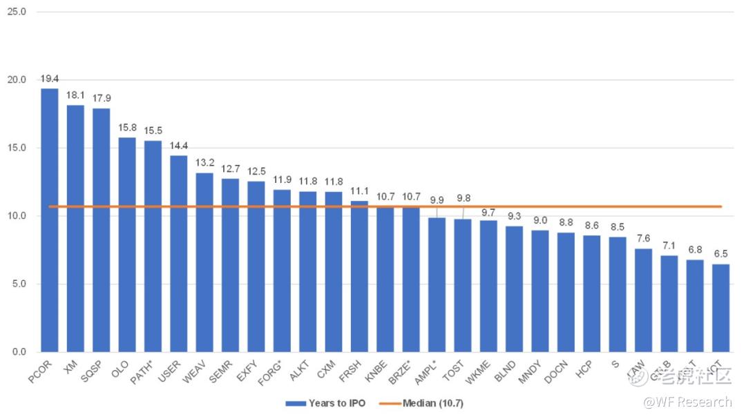 下图显示了各公司从成立到上市所花的年数,本组的中位数为 10.7 年。