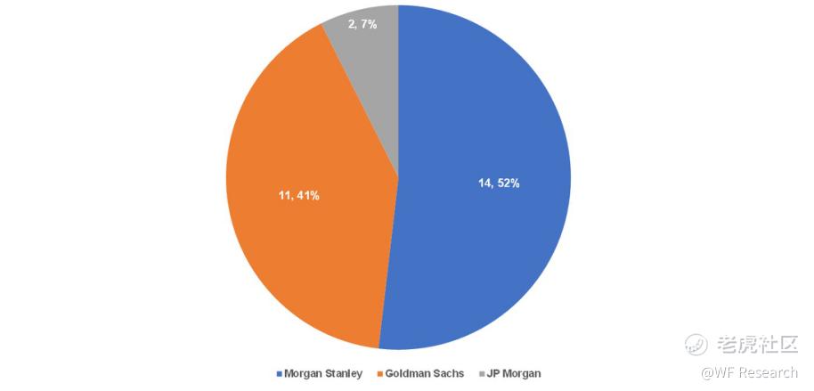 摩根士丹利和高盛通常会主导科技公司的上市,这些公司也不例外。摩根士丹利是这些公司的主要承销商和融资顾问,负责了 52% 公司的上市。