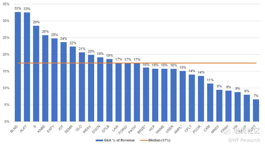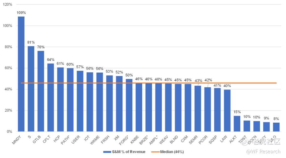 市场营销费用通常是 SaaS 公司支出最多的成本, 各公司LTM 市场营销费用的占比中位数为 46%。