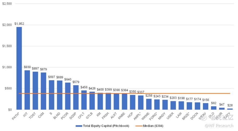 每家公司从公开市场筹得了大量资金,这些的中位数为 4.5 亿美元(包括了一级和二级市场的股份)。在这组公司中,只有两家公司没有进行过融资(Amplitude 和 Squarespace),这两家公司采用的是直接上市方式。