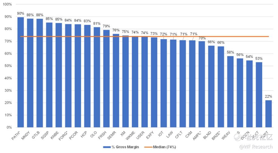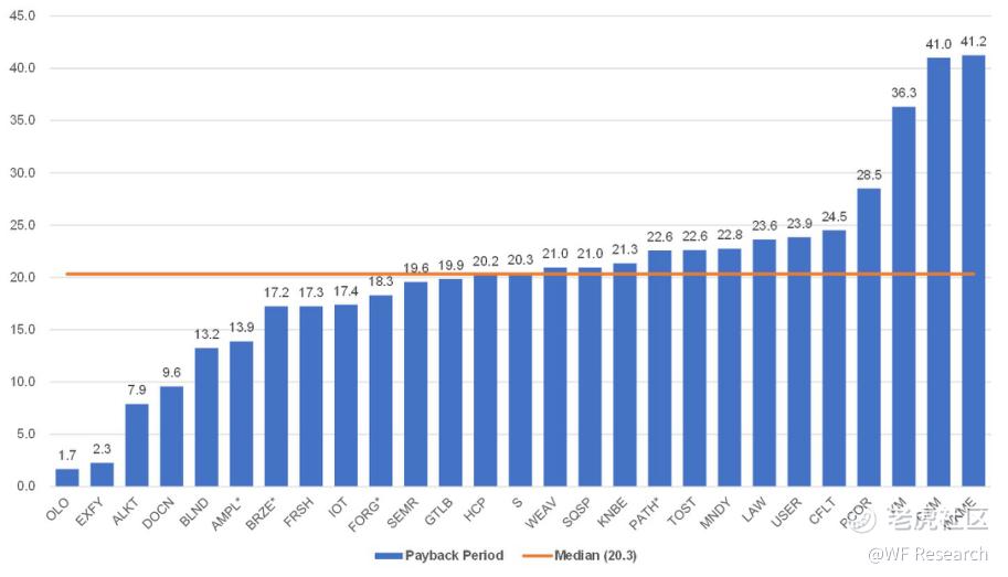由于大多数公司并没有披露其各季度新增客户的情况,因此很难对各公司的获客成本进行精准衡量。但可以通过 CAC 比率的倒数(LTM 净新增ARR * LTM 毛利率 / LTM 上一季度的市场营销费用)计算各公司的投资回报周期。本组公司,投资回报周期的中位数为 20.3 个月。