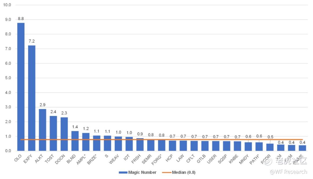 Magic Number 是一个可以用来衡量市场营销费用效率的指标,其计算公式为:LTM 净新增 ARR / 上一季度 LTM 市场营销费用。各公司平均Magic Number 的中位数为 0.8.