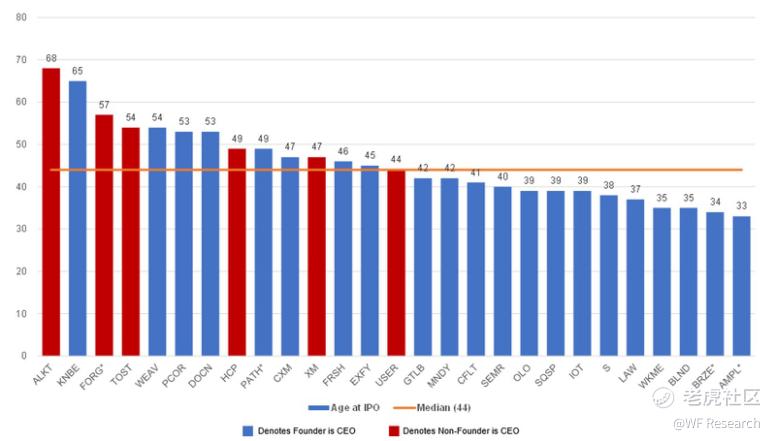 这些公司中,CEO 在公司上市时的年龄中位数为 44 岁。