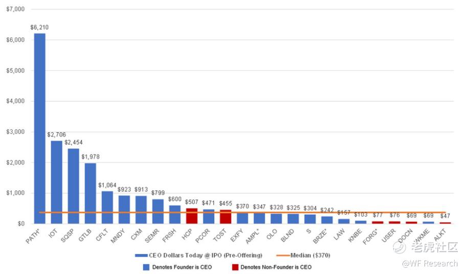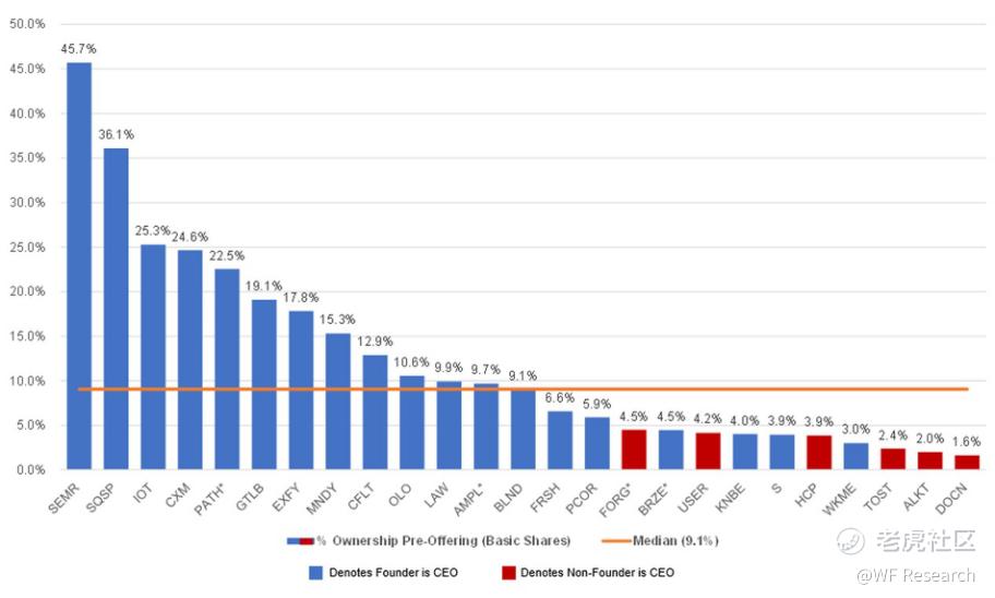 获得风险投资的公司,随着公司筹集越来越多的股权资本以支持自己的发展,CEO 和员工的股权通常会被大量稀释。这些公司中,发行前CEO 股权的中位数为 9.1%。下图的红柱表示的是 非创始人 CEO 的股权情况,可以看到,如果 CEO 是公司创始人,其会拥有更多股权。CEO兼创始人的股权中位数为 10.6%,非创始人的 CEO 股权中位数为 2.2%。Weave 和 Qualtrics 并没有显示在下图,因为它们在上市时,CEO 的股份小于 1%,因此没有披露。