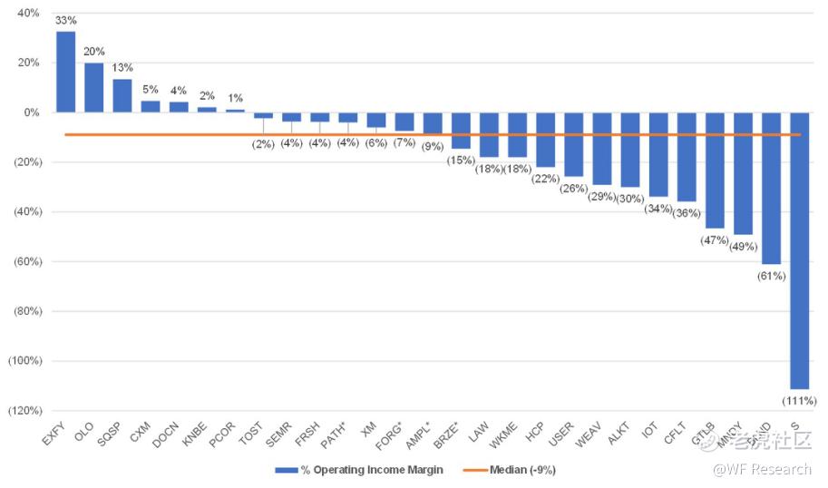 按非 GAAP 计算企业营业收入的话,几乎每家公司都是亏损的,只有 7 家公司在各自上市前的 4 个季度是盈利的。按非 GAAP 计算的 LTM 营业利润率的中位数为 -9%。
