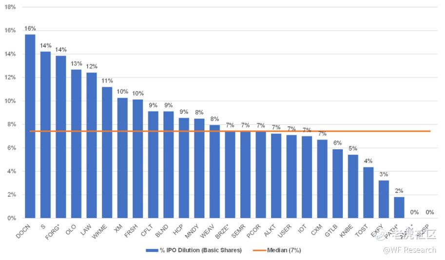 这些公司中,在 IPO 时的股权稀释率中位数为 7%。由于 Amplitude 和 Squarespace 采用直接上市的方式,因此他们没有发行新股。