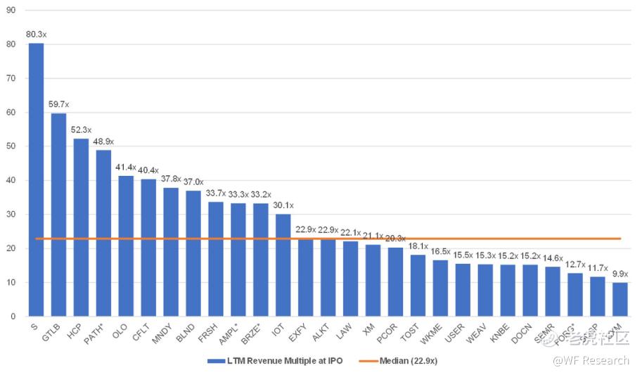 以下是各公司 IPO 价格(参考价格)除以 LTM 收入的企业价值。其倍数中位数为 22.9 倍。