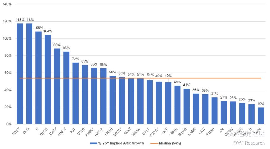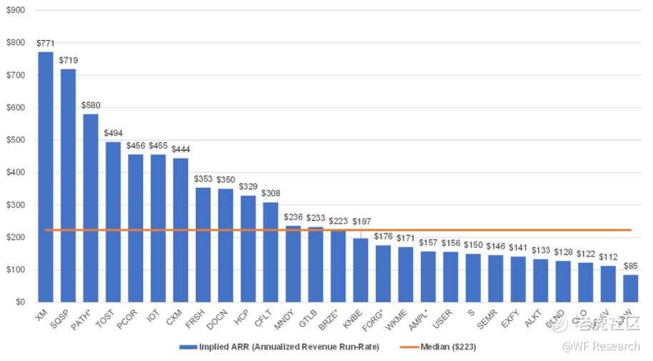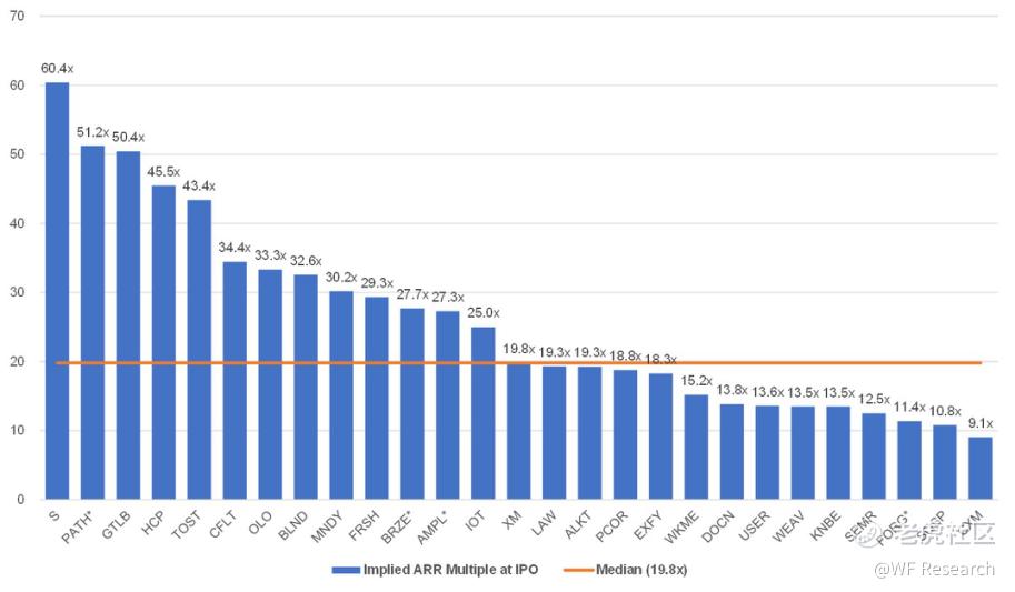 下图是隐含 ARR 的企业价值倍数,其中位数为 19.8 倍。