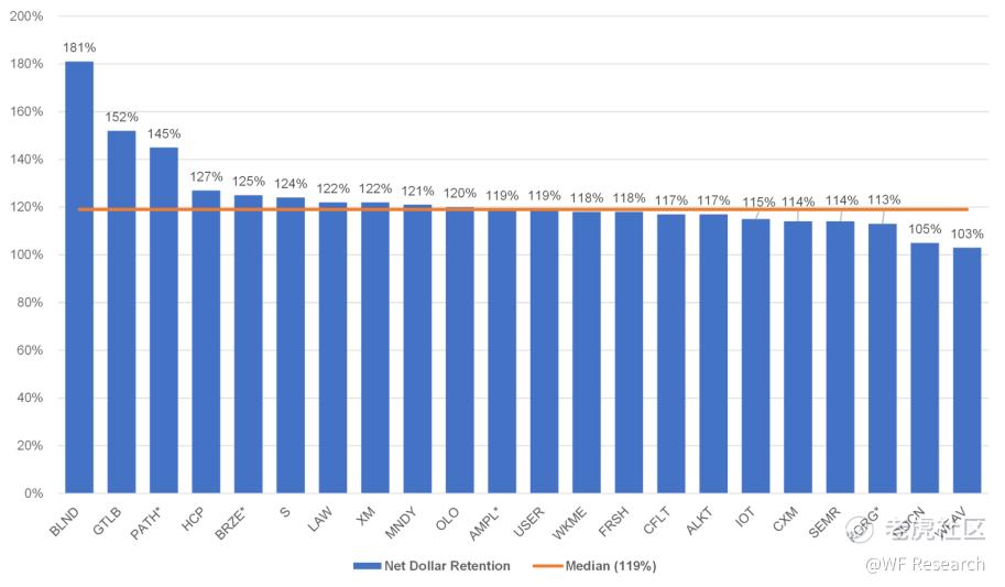 留存率和扩张率是 SaaS 公司的主要 KPI。根据所披露的数据显示,各公司净收入留存率的中位数达 119%(不同公司对留存率的定义并不相同)。其中,Knowb4、Expensify、Procore 和 Squarespace 在公司 IPO 时没有披露这一指标。