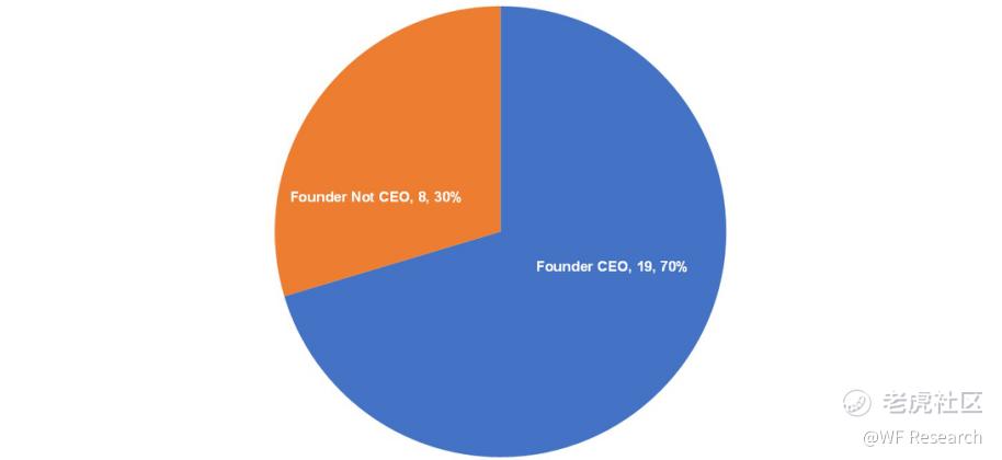 一些公司在上市时,会聘请新的 CEO,但如下图所示,70% 的公司在 IPO 时还是由创始人担任 CEO。