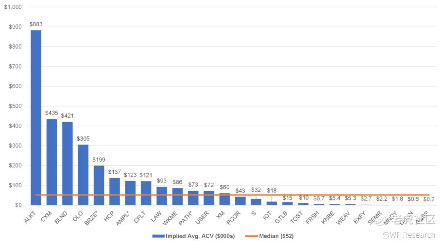 上市公司通常并不会披露客户的详细情况,因此很准确地知道他们的所有客户实际支付了多少费用,但大多数情况下,还是可以计算出其平均值。下图是各公司在 IPO 披露的季度收入除以客户总数的值 —— 如下图所示,其差异相当大。本组公司的中位数为 5.2 万美元。