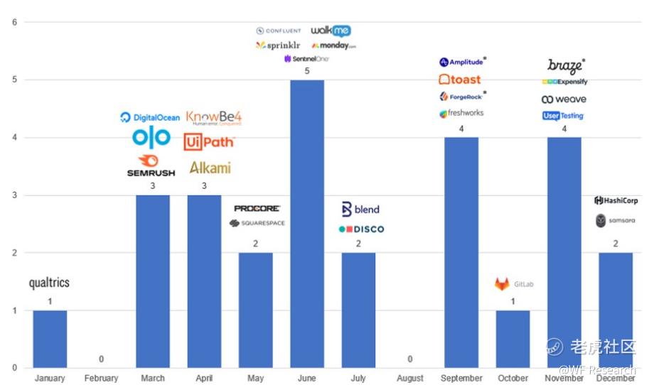 下图是 2021 年各月上市 SaaS 公司的数量和名称。