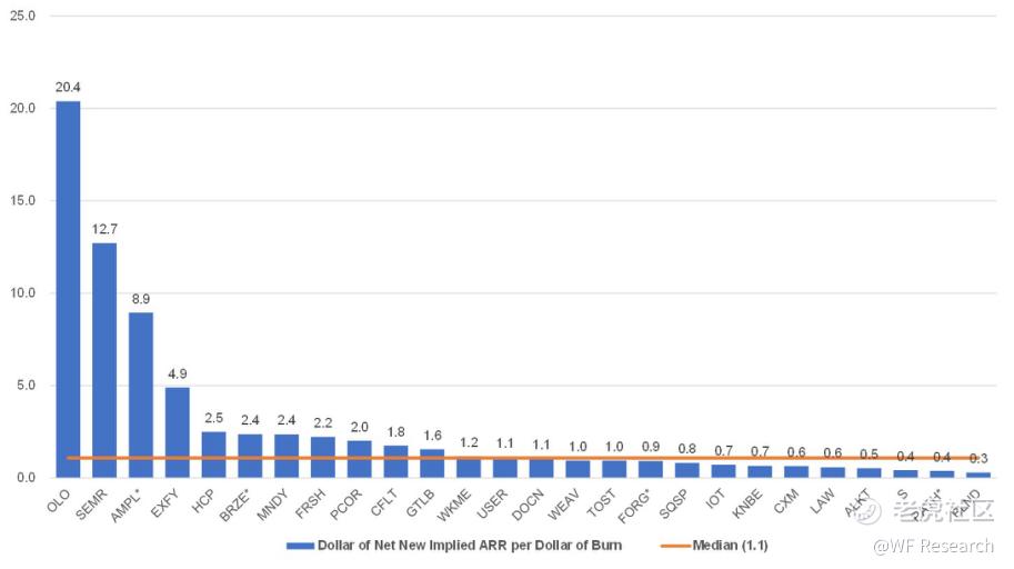下图是各公司在 IPO时的季度隐含 ARR 与隐含净现金消耗(包括融资、债务和收入)比,其中位数为 1:1。但像 Olo、SEMrush 和 Amplitude 这样的公司,它们有着明显的正向比率。