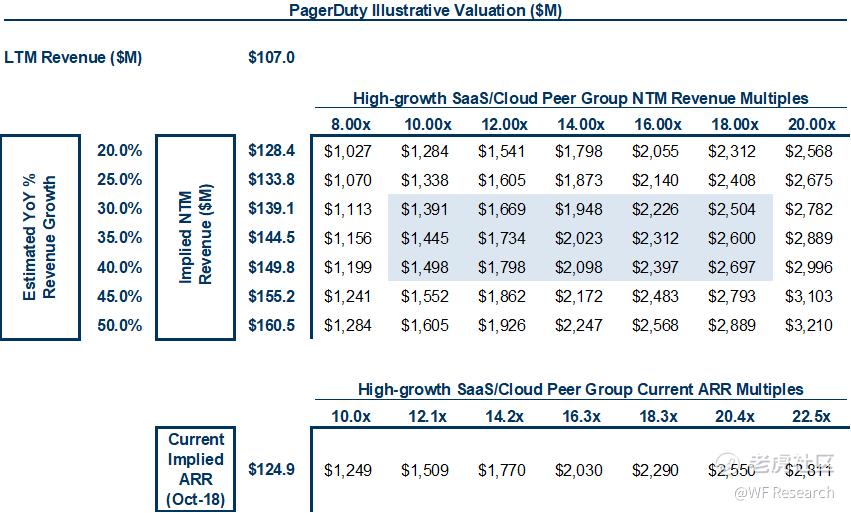 几乎和所有 IPO 的 SaaS 公司一样,PagerDuty 的估值可能是预期收入的好几倍,因为它们的增速很快,但盈利能力不足。下图以 NTM(未来 12 个月)收入为代表,以增长率的说明范围为基础(公司并没有在 S-1 中发布预测)。请注意,PagerDuty 将在随后的报告中公布全年的收入情况,但对于此次分析,我们只有截至 2018 年 10 月的收入数据。下图是基于其他高增长的上市 SaaS 公司的隐含ARR倍数(订阅收入 * 4)。根据目前的公开信息,PagerDuty 的交易价格很可能会远高于他们最后一轮融资的 12 亿美元估值。