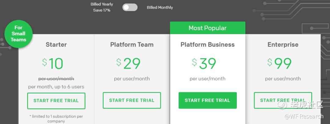 PagerDuty 的市场营销非常有效。他们采用自助式服务的策略,并提供 14 天的免费试用 —— 大多数客户从免费试用开始,随着时间的推移,他们的使用会逐渐增加。公司拥有一支针对中端市场和中小企业客户的内部销售团队,以及一支针对企业客户的线下销售团队,以此来补充自助式业务。这可能是一个高度可预测的业务,因为几乎所有的收入都来自现有的客户 —— 在最近的几年约占 90%。例如,在截至 2018 年 10 月的 9 个月里,客户总数同比增长仅 14%,但同期收入增长了 48%,PagerDuty 有 4 种定价:初级(Starter)、小团队(Platform Team)、公司级(Platform Business)和大企业级(Enterprise)。网站的定价情况如下: