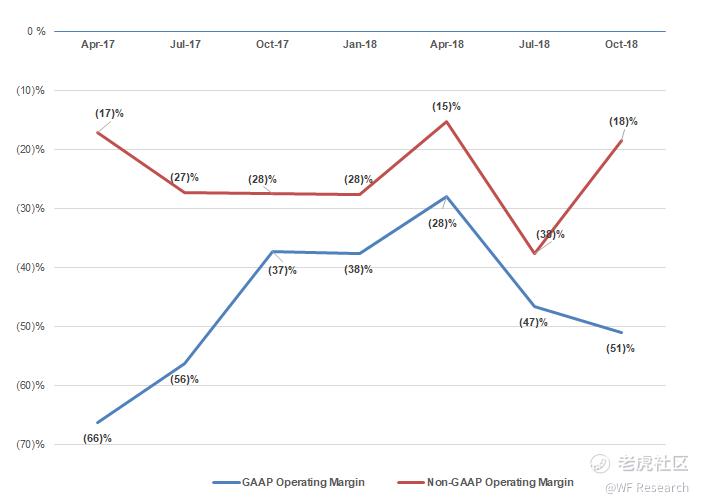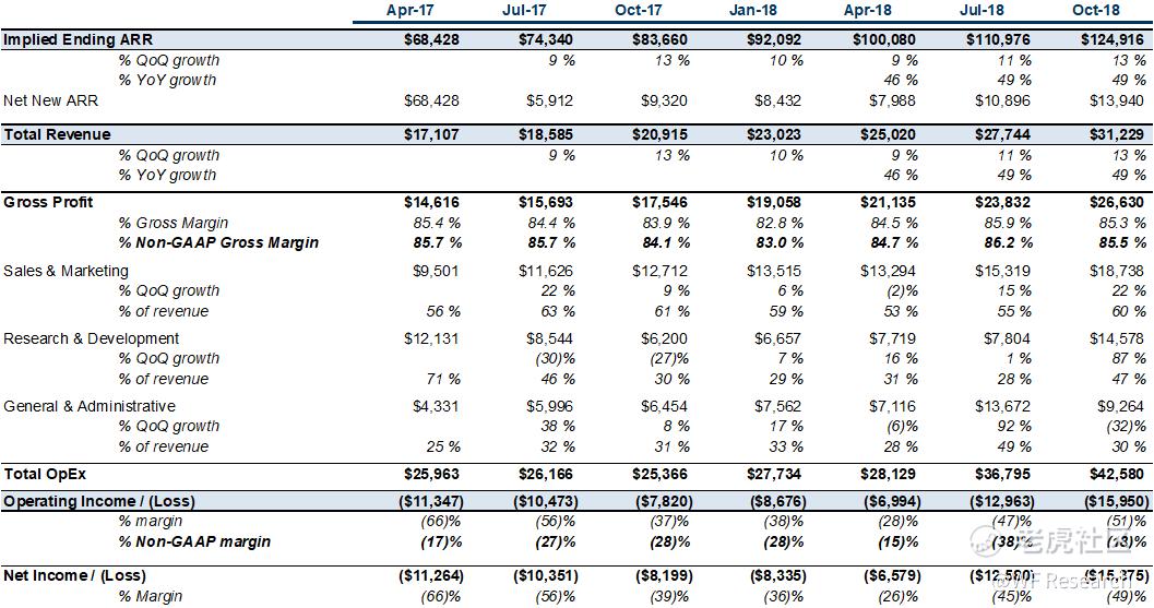 公司的指标无疑令人印象深刻。PagerDuty 增长迅速 —— 在最近的一个季度,他们的收入同比增长了 40%。考虑到它是一个十分容易整合的产品,专业服务的收入并不重要,收入100%基本上都是经常性收入。考虑到这一点,截至 2018 年 10 月,公司的隐含 ARR 为 1.249 亿美元(季度收入 * 4),同比增长 49%。目前,PagerDuty 仍在亏损,上一季度的 GAAP 营业利润率为 51%,非 GAAP 营业利润率为 18%。以下是他们在 S-1 中披露的一些统计数据: