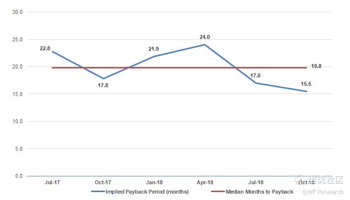 PagerDuty 没有按季度公布客户数量,下图使用 CAC 比率(隐含的净新 ARR * 毛利率 / 上一季度的销售和营销支出)绘制了客户的隐含回报期。回报期的中位数是 20 个月。