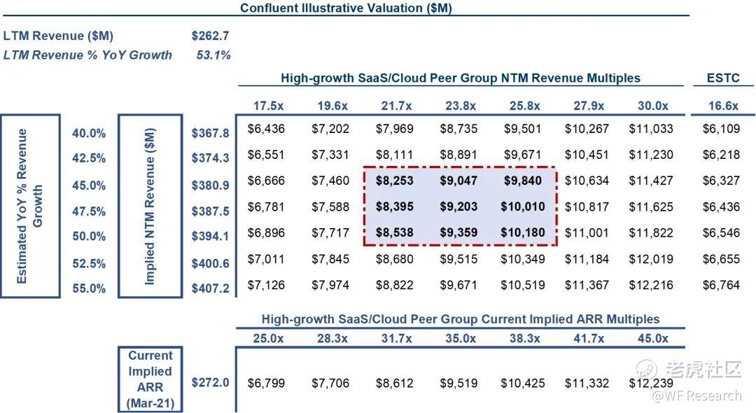 Confluent 将像其他高增长的 SaaS 公司一样按远期收入的倍数进行交易。下面的数据包括了:能够说明增长率范围的NTM(未来 12 个月)收入、来自其他上市高增长 SaaS 公司的可比 EV(企业价值)/NTM 收入倍数,以及隐含 ARR 的倍数范围。 正如在其他文章所提到的,公司不会在 S-1 中发布任何预测或指导。Confluent 很可能会在其他高增长 SaaS 公司的估值范围内进行交易,这将比他们上一轮 45 亿美元的私募融资高出 2 倍多。Elastic 目前的 NTM 收入倍数在表格的右边,Confluent 可能比 Elastic 有更高的溢价。