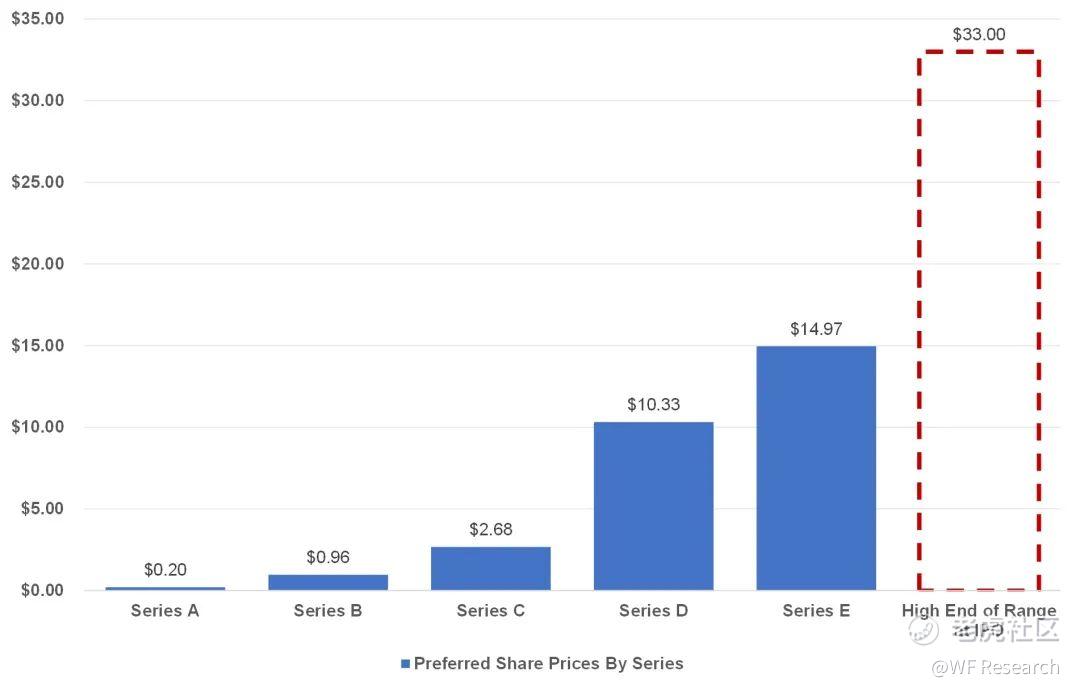 下图显示了一段时间内优先股的价格。按照美股 33 美元(区间的高端),Confluent 的市值将达到 107 亿美元,其股价较 15 个月前的 E 轮融资上涨了 120%。