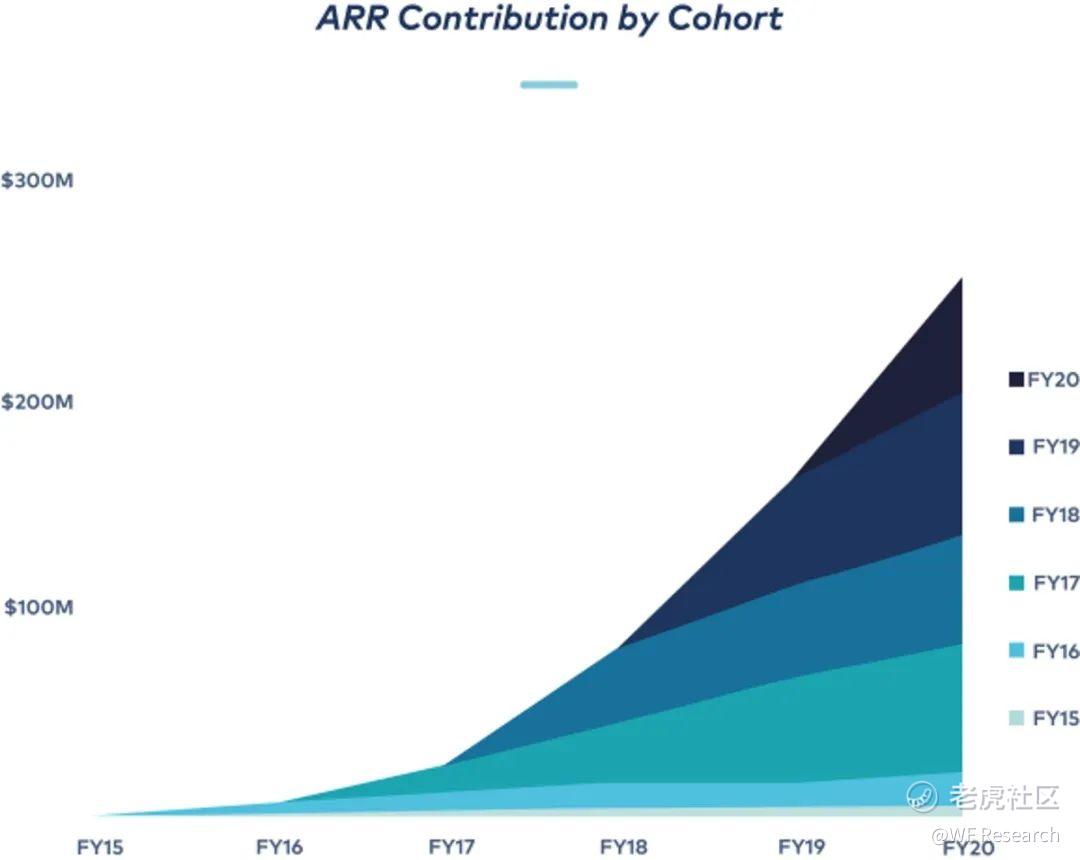 下图是 Confluent 的 ARR(年度经常性收入)群组情况。例如,2017 年的群组代表了在 2017 年 1 月 1 日至 2017 年 12 月 31 日期间从该公司进行首次订阅的所有客户。2017 财年这一群体的初始 ARR 从 1500 万美元增加到 2020 财年的 6200 万美元,增长了 4.1 倍。