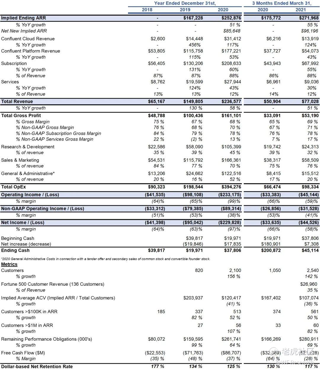 - 截至 2021 年 3 月 31 日,Confluent 的客户包括了 Fortune 500 中的 136 家。在截至 2021 年 3 月 31 日的三个月里,这 136 家企业贡献了 Confluent 大约 35% 的营收,金额达 2700 万美元。