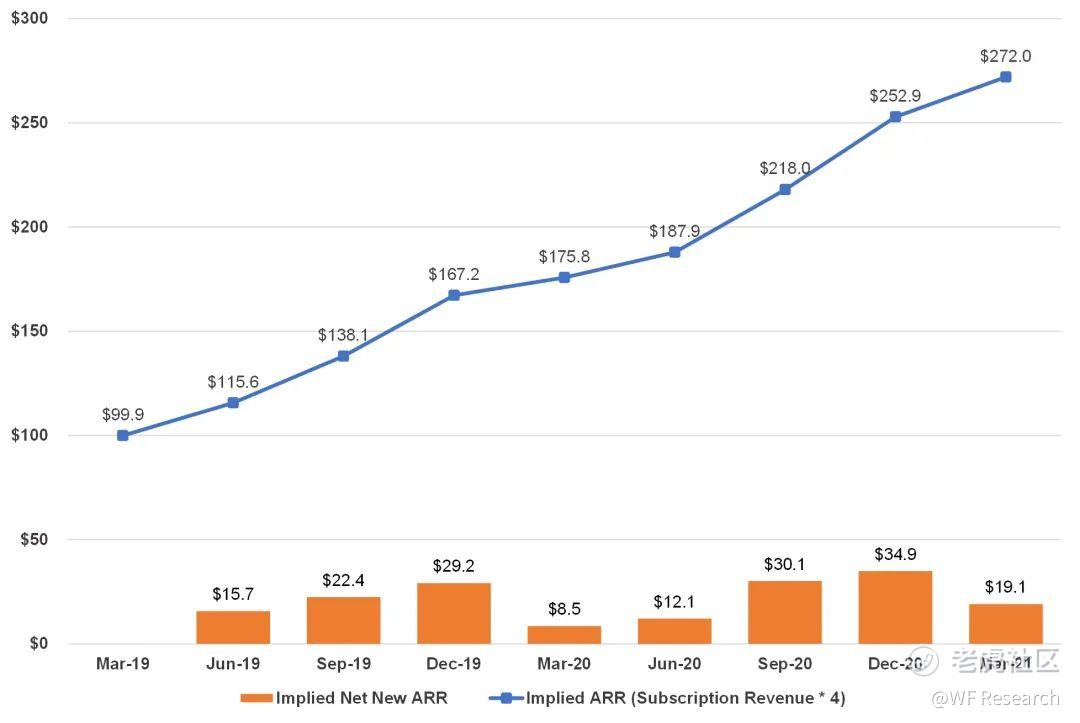 下图 Confluent 和 Elastic 的隐含 ARR 增长变化,两家公司在本季度的订阅收入为 2500 万美元 /隐含 ARR 为 1 亿美元,两者的增长轨迹相当相似。