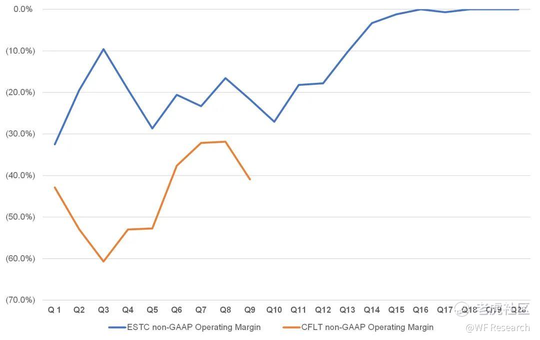 虽然他们的增长速度相似,但从非 GAAP 的运营利润率来看,Elastic 到目前为止比 Confluent 更有效率。利润率以这两家公司的隐含 ARR 超过 1 亿美元的季度为指标。