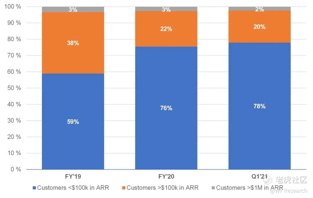 下图是根据 ARR 的大小,对客户进行划分的占比情况图。大型客户和云计算客户(两者在一开始时都较小)都在高速增长。