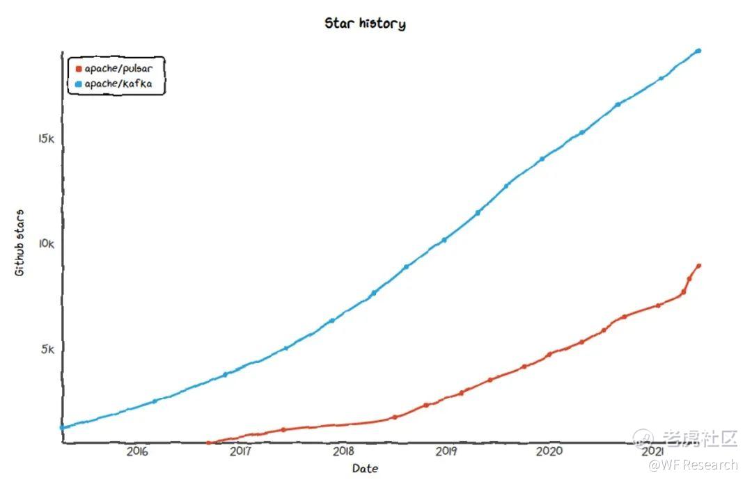 Confluent 表示他们的主要竞争对手是企业内部 IT 团队,因为该团队开发了自己的动态数据基础设施,这些基础设施在很多情况下都基于 Apache Kafka (Confluent 创始人开发的开源项目)。因此,使用开源产品而不付钱给 Confluent 的团队来说是一个很大的威胁,这对于大规模流行的开源项目和将它们商业化的公司来说并不罕见。Confluent 还列举了其他几个领域的竞争对手:1.拥有 Azure Event Hubs、AWS Kinesis 和 DynamoDB Streams以及 Google 的 Cloud Pub/Sub 和 Cloud Dataflow 等产品的云服务商;2.已经转向这一领域的传统产品,如:TIBCO Streaming。Cloudera Dataflow、Redhat(IBM)、AMQ Streams 和 Oracle Cloud Infrastructure Streaming;3.其他具有竞争性的开源项目,Confluent 并没有透露这些项目的名称。例如,Apache Pulsar 是 Kafka 的竞争性产品,正越来越受人们关注。下图是 GitHub 的 Star History;Puslar 起步较晚,但与 Kafka 的发展轨迹相似。GitHub 的 Star History 并不是吸引用户的真实来源,但它能够很好地反应一个项目的受欢迎程度。此外,Confluent 推出的云产品是在云服务商之上提供的,如果这些云服务商也提供竞争性产品,Confluent 会在云计算领域面临更多的竞争。