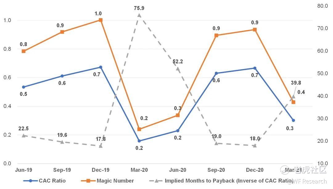 Confluent 并没有按季度发布客户数量,下图是他们使用 CAC 比率的倒数来表示的隐含获客回收期(隐含 ARR 净值 *非 GAAP 毛利率 / 上一季非 GAAP 销售和营销支出)。Magic Number 被定义为隐含的新 ARR / 上一季度的非GAAP 销售和营销支出。在披露期内,获客回收期的中位数是 21 个月(8 个季度)。Covid-19 对去年第一季度和第二季度销售效率的影响很大。