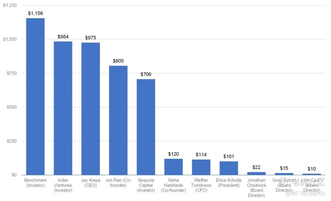 假设每股价格为 33 美元(目前区间的高端),下图显示了主要股东所持股票的价值。Benchmark 以近12亿美元的股份成为最大的赢家。首席执行官 Jay Kreps 的股份将价值近 10 亿美元。请注意,这只包括已披露其股份的投资者,不包括其他主要投资者(如 Coatue),他们拥有不到 5% 的股份,并不是董事会成员。