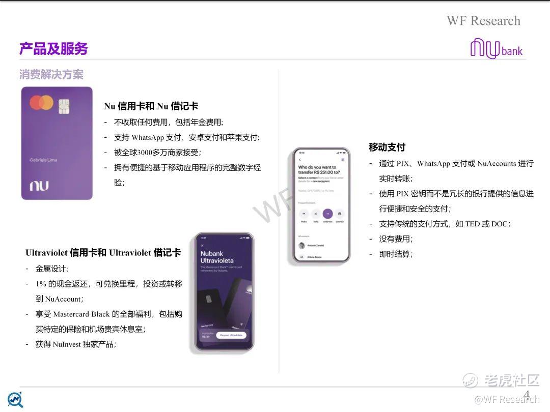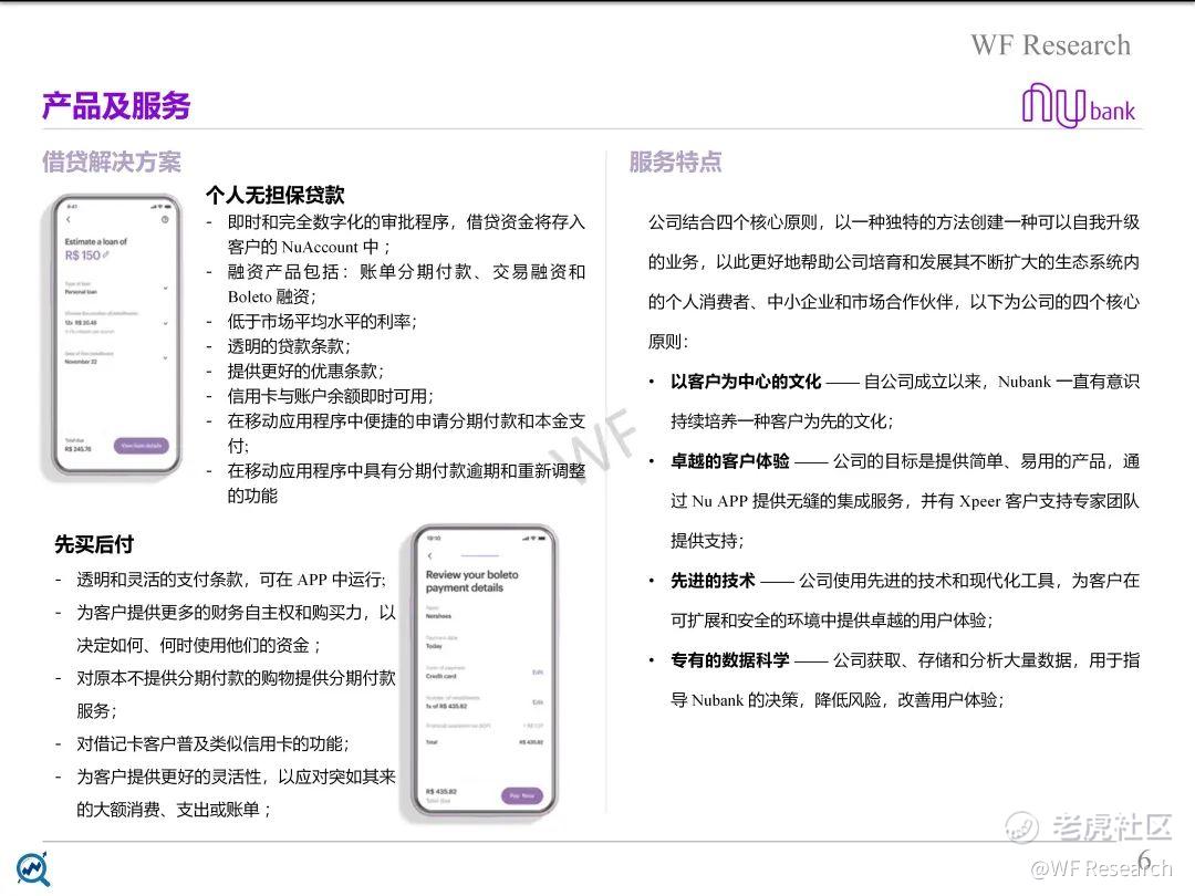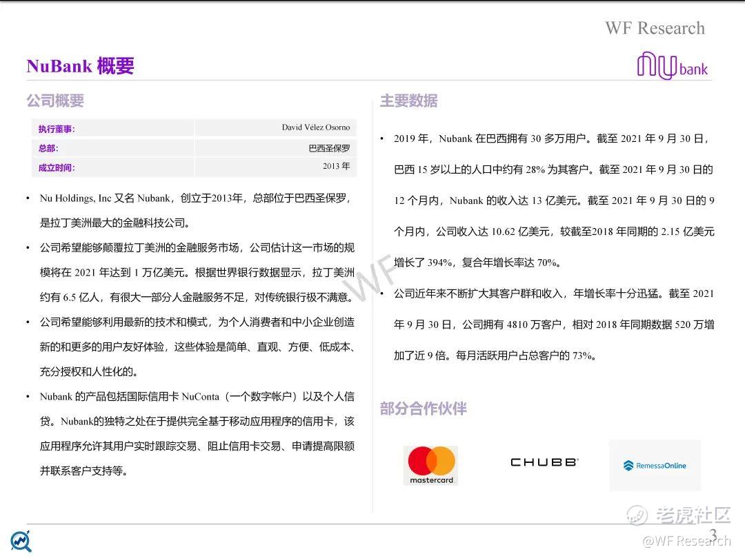 Nubank是一个数字银行服务提供商,主要产品为万事达卡以及配套的手机APP,可为用户提供在线管卡、逾期提醒、消费记录查询、资金冻结等服务。