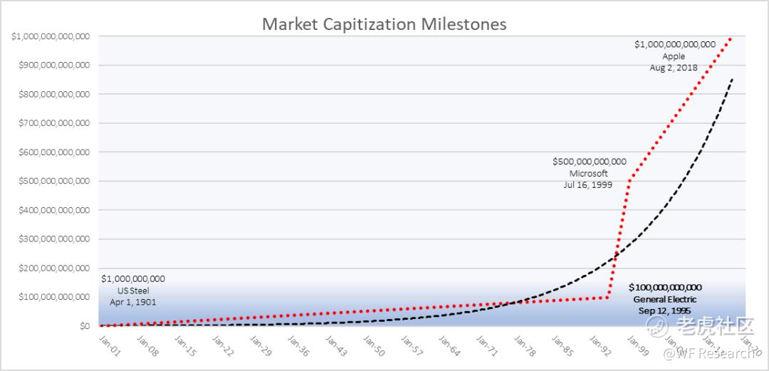 随着时间的推移,公司的最大价值是如何变化的呢?1901 年,US Steel(美国钢铁公司)是第一家在上市时估值达到 10 亿美元的美国公司。General Electric(通用电气)花了 95 年的时间才达到另一个里程碑 —— 1000 亿美元大关;四年后,Microsoft 达到 5000 亿美元大关;在美国第一家十亿美元公司的 117 年后,Apple 的市值在 2018 年达到 1 万多亿美元。很明显,公司的增长不是一个线性函数,而是以指数形式增长着。