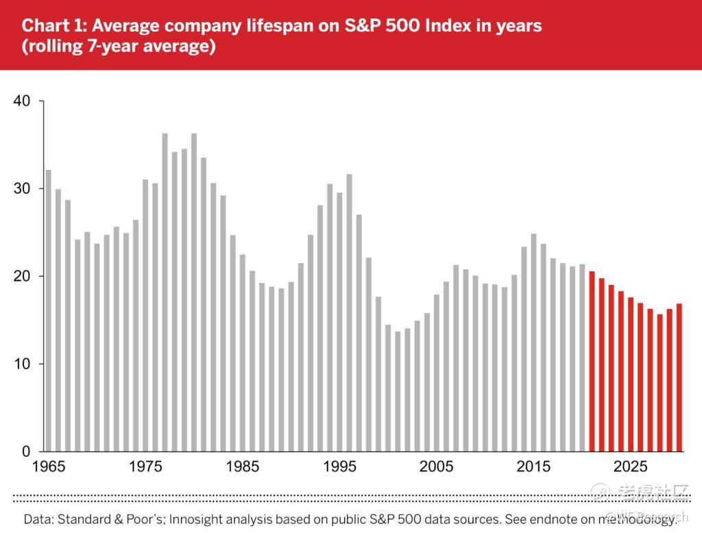 值得注意的是,S&P 500 指数公司被规模更大的新公司取代的速度在持续上升。在 20 世纪 70 年代末,S&P 500 指数公司的平均任期为 30~35 年,而现在预计这十年将缩减至 15~20 年。