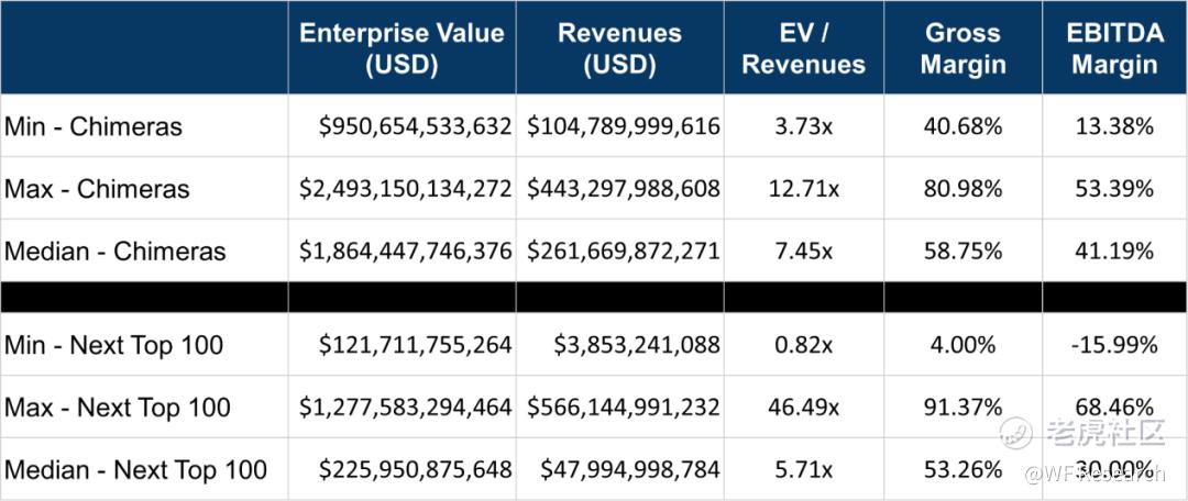 我们的团队还整理了一份市值排名前 100 的公司名单,以更好地评估和理解迄今为止人类文明创造的最大上市公司的性质。下面是奇美拉公司与按市值计算的前 100 强公司之间的统计数据比较。