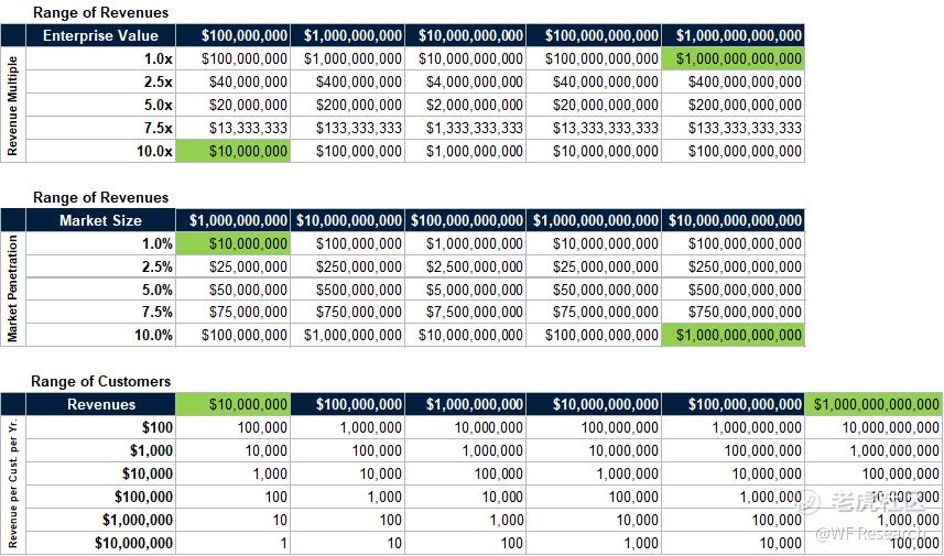 无论一家公司销售的是数字产品还是实体产品,或者是两者的结合,市场规模的重要性都是一样的。一家市值超过 1 万亿美元的公司必须能够应对一个巨大的市场机会,并且影响非常多的客户群体。达到 1 万亿美元估值所需的客户数量将由所使用的收入模型决定,这将是一个高价低量的游戏或低价高量的游戏,或两者兼而有之,其估值是公司收入乘以收入倍数。