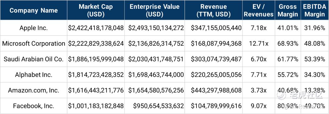 营收在 1000 亿美元或以上的公司,其所面对的市场机遇的规模完全不同,按 1~10 倍的收入倍数计算,其价值可以达到 1000 多至 1 万多亿美元。目前营收规模最小的是 Facebook,其营收约为 1040 亿美元,市盈率约为 9 倍,估值约达 1 万亿美元。