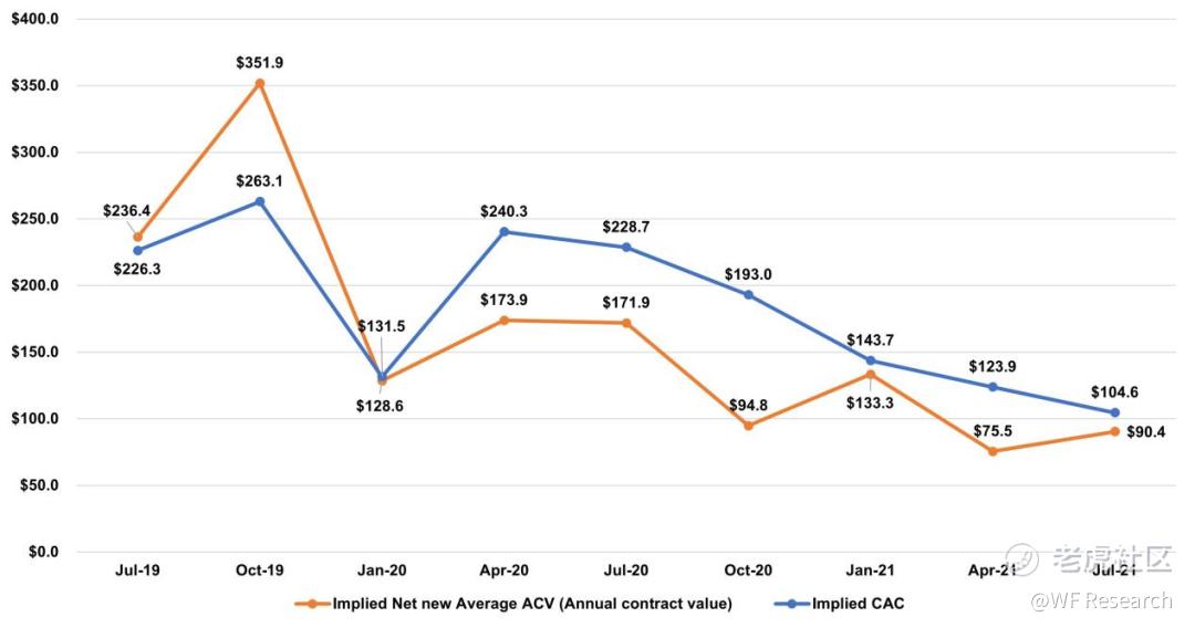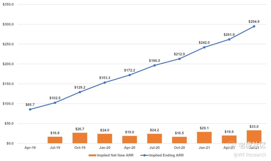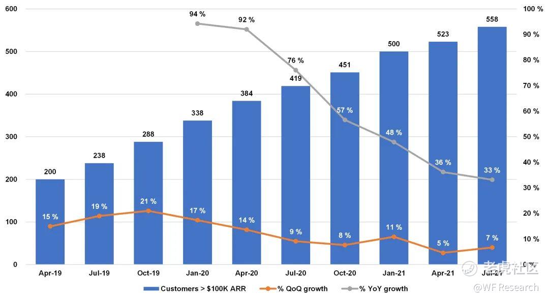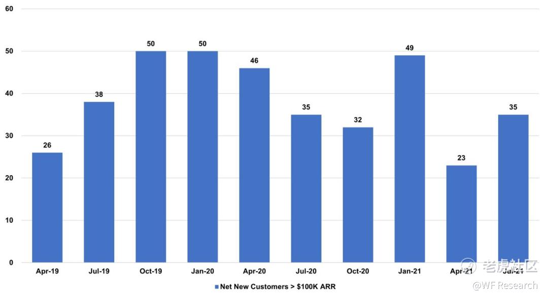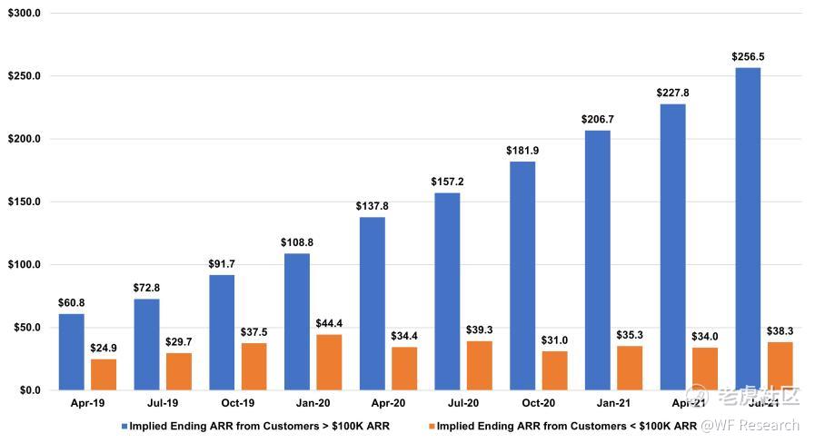 ARR 大于 10 万美元的新客户,增长相对平缓。因为隐含平均 ACV(隐含 Ending ARR / 客户数)正在迅速增长,因此,即使新客户的净增长相对平稳,但这一部分的收入也在迅速增长。