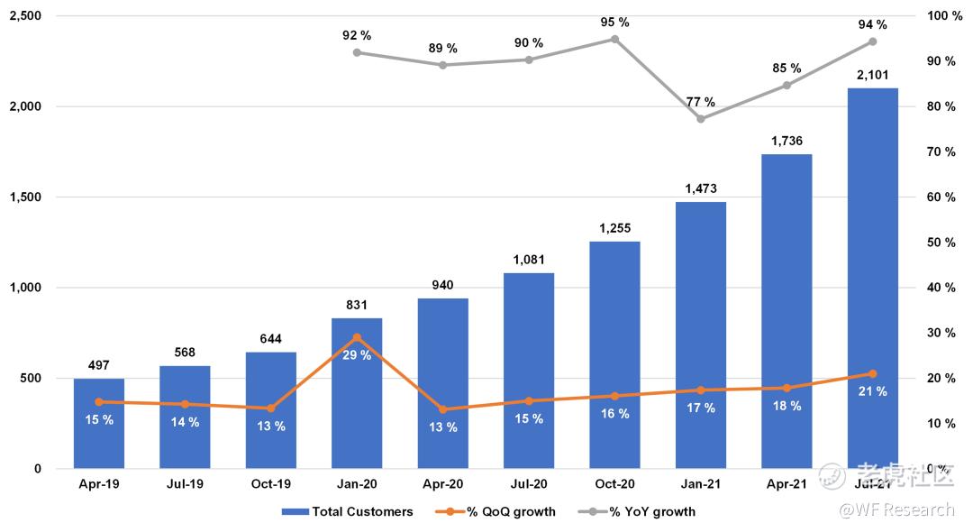 下图是 HashiCorp 的客户数量变化情况。目前,HashiCorp 拥有 2100 多名客户,客户数量同比增长近 100%,收入同比增长近 50%。