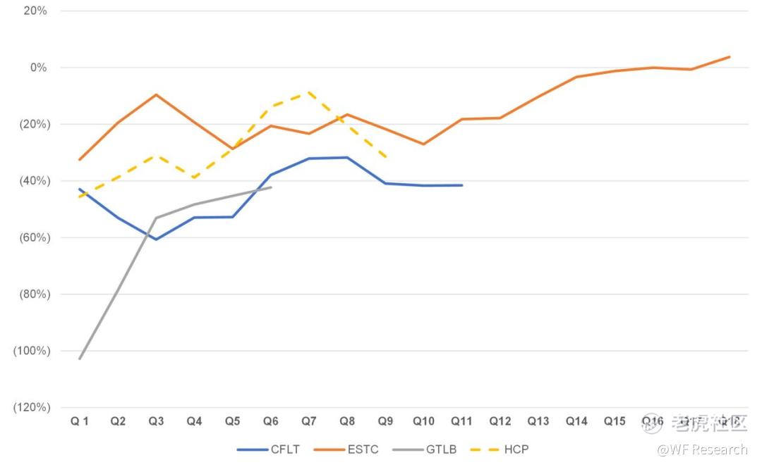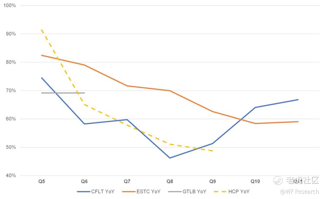 我们选取了 第5 至 11 季度的指数,并查看了同比增长率。虽然 HashiCorp 在一开始的时候增长最快,但仅过了 4 个季度,该公司的同比增幅就从 91% 降至 49%,这是一个明显的减速。Confluent 的年收入增长率趋势与 HashiCorp 类似,但在第 7 季度之后的两个季度里又重新获得加速增长。HashiCorp 很可能希望有与 Confluent 相同的计划,以此让他们能够获得与 Confluent 同样的估值倍数。