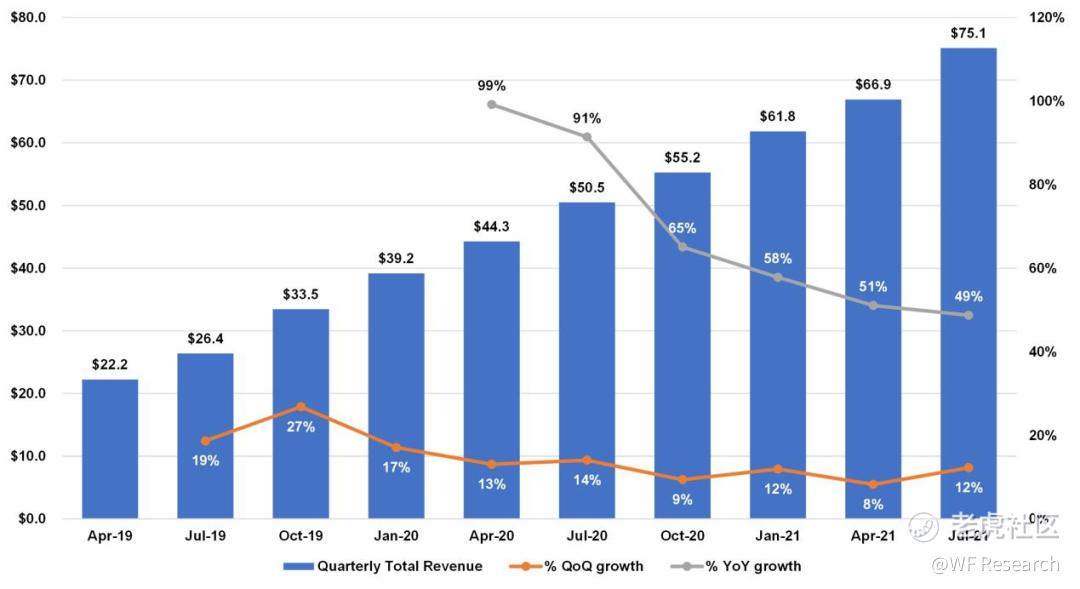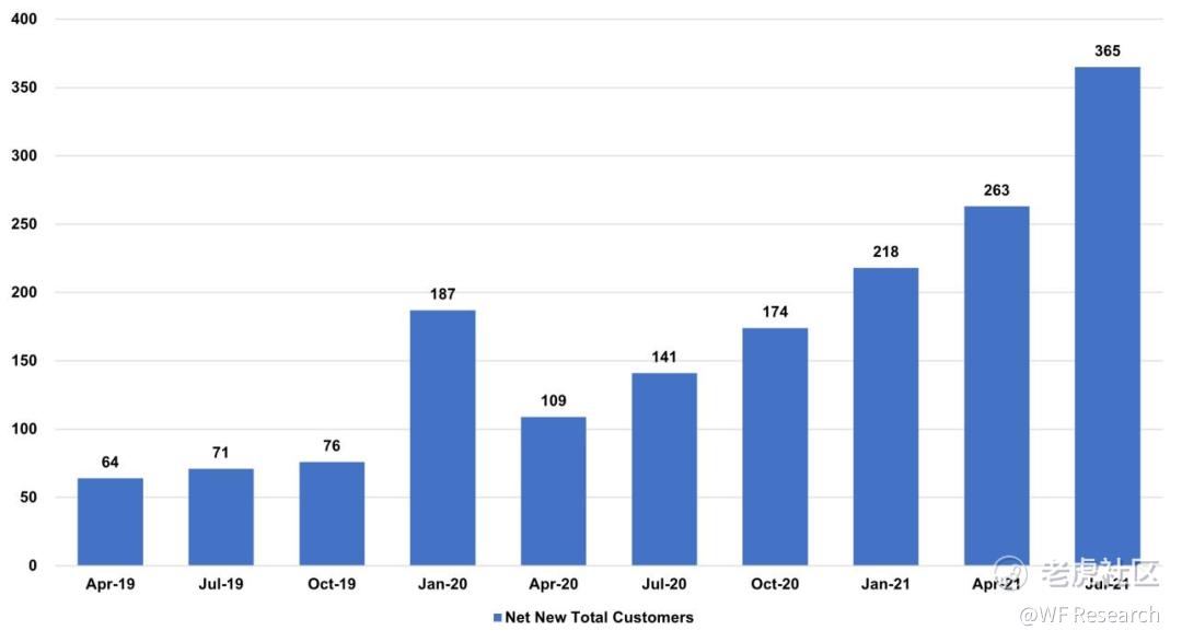 下图是 HashiCorp 各季度净新增客户情况,可以看到增长十分迅速。唯一的连续放缓是在 2021 财年第一季度,因为该季度恰逢 COVID 的爆发,以及上一财年刚获得大规模增长的第四季度。