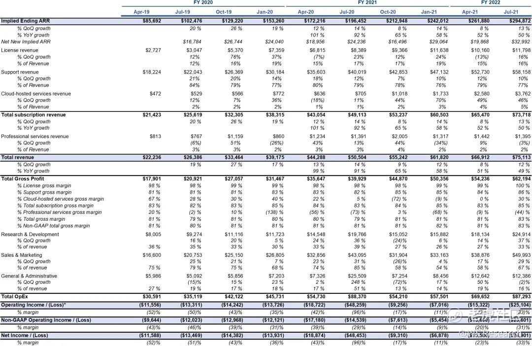 - 非 GAAP 的总毛利率为 83%,非 GAAP 的订阅毛利率为 85%,非 GAAP 的专业服务毛利率为 -44%。