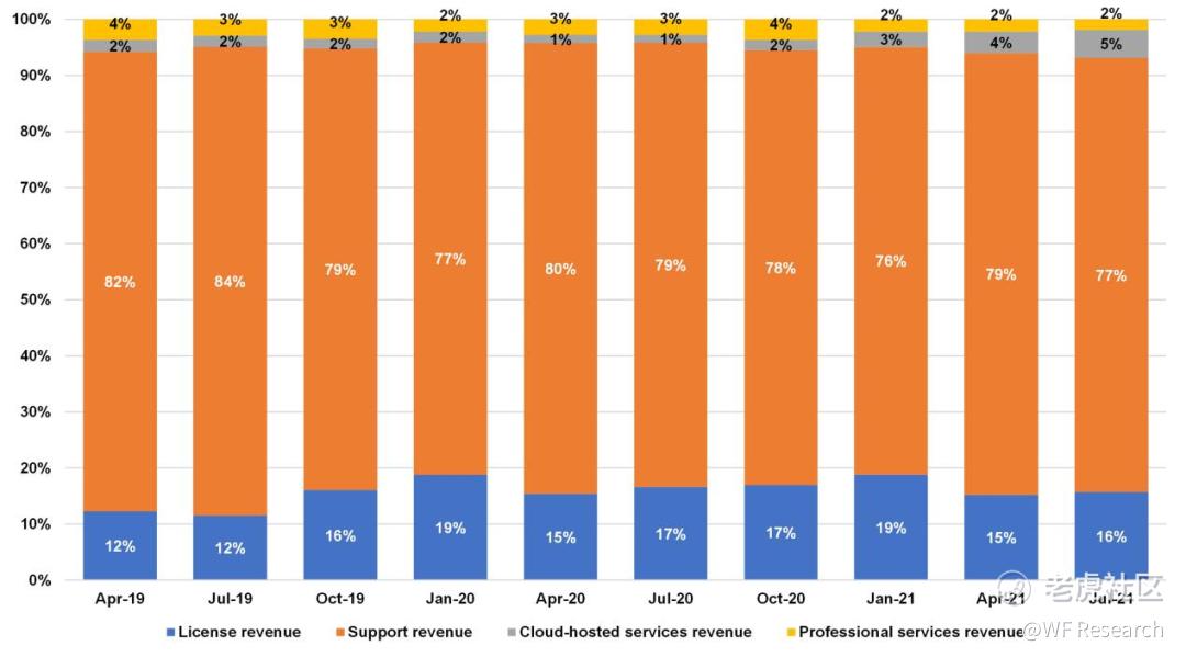 HashiCorp 98% 的收入为订阅收入,收入构成如下图。HashiCorp将许可、支持和云托管服务收入定义为订阅。