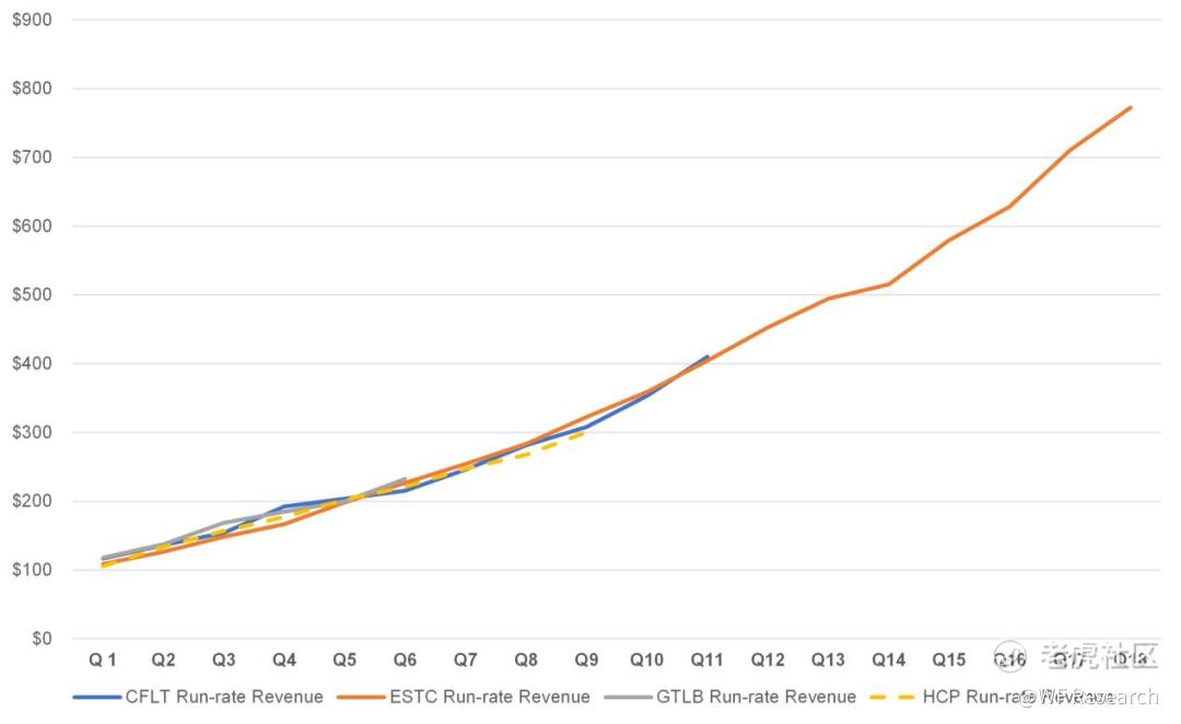 鉴于已有几家公司上市:Confluent 和 GitLab 在最近上市,Elastic 在 2018 年上市,以下是基于类似营收规模的公司的对比分析。 这些公司在增长方面都非常相似。Elastic(NYSE:ESTC)在 2018 年上市,目前市值 169 亿美元,Confluent(NasdaqGS:CFLT)和 GitLab(NasdaqGS:GTLB)在过去几个月上市,市值分别为 238 亿美元和 187 亿美元(截至 2021 年 11 月 10 日)。