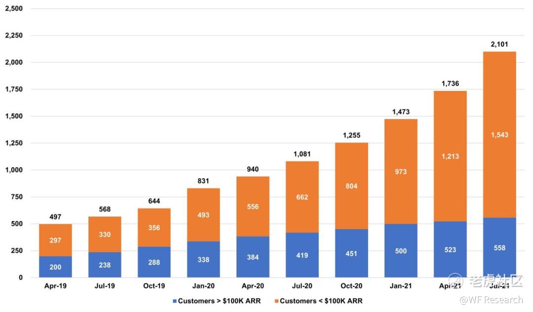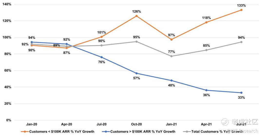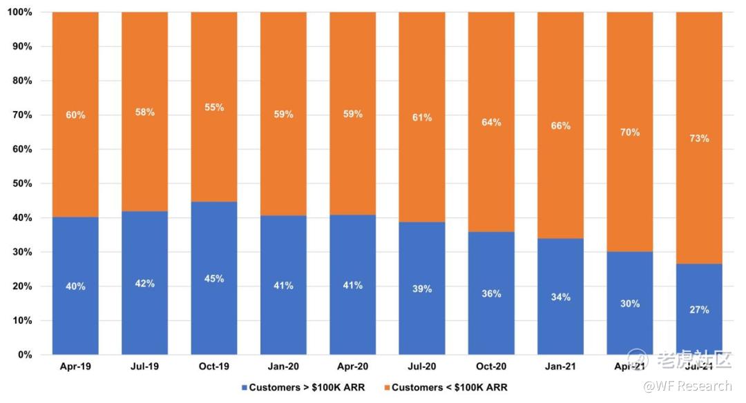 下图显示的是 ARR 大于 10 万美元和 ARR 小于 10 万美元的客户占比情况。我们可以发现,ARR 小于 10 万美元的客户,增长十分明显。