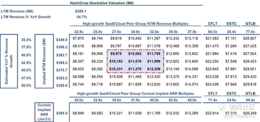 HashiCorp 的交易方式将与其他没有盈利的高增长 SaaS 公司一样:按预期收入的倍数计算。下图便是根据 NTM(未来12 个月)收入计算而来的值,NTM 收入是基于其他公开的、高增长的 SaaS公司的增长率范围和可比 EV(企业价值)/NTM 收入倍数计算的。下表还显示了隐含 ARR 倍数的范围。在S-1中没有提及。下表还显示了 HashiCorp 的隐含企业价值(如果他们最终以Confluent、Elastic 和 GitLab 等公司的相同倍数进行交易)。选择这三家公司是因为它们也是高增长的开源上市软件公司。虽然 HashiCorp 的增长速度略低于 Confluent 和 GitLab,但在交易价格上可能会与它们更为接近,而不是 Elastic。 该估值的中间值是他们在 2020年 3 月私募融资 53 亿美元的两倍多。鉴于公开市场对 SaaS 公司的热情,这一价格可能会更高。