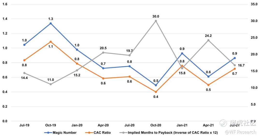 HashiCorp 按季度公布了客户数量情况,因此我们可以根据净新增客户数(仅对新客户没有披露)来查看隐含 CAC,并使用 CAC 比率的反比(新增隐含 ARR 净额 * 非GAAP的毛利率 /上一季度非GAAP的销售和营销支出)来绘制其隐含的投资回报周期。Magic Number 的公式是隐含的净 ARR 除以上一季度非 GAPP 的销售和营销支出。在披露期内,投资回报周期的中位数为 16.7 个月。
