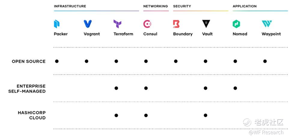 与大多数软件公司不同,HashiCorp为其客户提供了一套广泛的产品和部署模型。公司认为“基础技术能够解决采用云计算作为核心基础设施所面临的挑战,并使运营能够发挥公有云和私有云的所有潜力”。HashiCorp 的产品使用通用的设计原则,以实现基础设施的自动化、广泛的生态系统支持,以及从业人员的自助服务。他们的产品主要是自我管理型产品(内部部署),客户可以在公有、私有和混合云的环境中进行部署。虽然 HashiCorp 的云平台(HCP)只占上季度总收入的 5%,但却是业务增长最快的部分(根据 2020 财务数据)。该公司采用开放的核心软件进行开发,所有的产品都是开源的。该公司还拥有一个由用户、贡献者和合作伙伴组成的大型社区,可在产品的开发生命周期内进行协作。尽管如此,HashiCorp 仍保持着代码库的控制权,虽然任何人都可以提出代码贡献,但在将这些代码整合到代码库之前,HashiCorp 会对进行审查。HashiCorp 的产品可以单独进行使用,同时也可以作为一个堆栈一起工作。