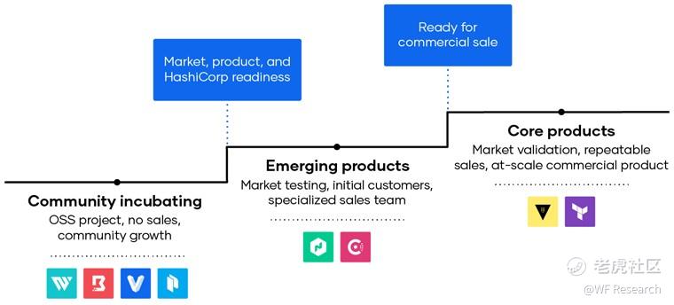 HashiCorp 还拥有许多其他产品,如 Waypoint、Boundary、Vagrant 和 Packer,这些产品解决了实现云运营模式类似的挑战。下图描述了该公司从社区孵化到大规模商业产品的发布及发展新产品的方法。